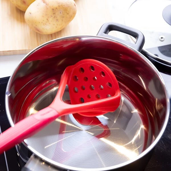 The silicone red masher is heat resistant up to 260°C and is also suitable for dishwasher cleaning.
