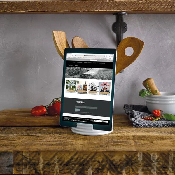 This James Martin Cook Utensils Pot also doubles as a tablet/phone holder, ideal if you are following an online recipe. Made from porcelain, this utensils pot has a soft grey outer glaze with a crisp white interior.