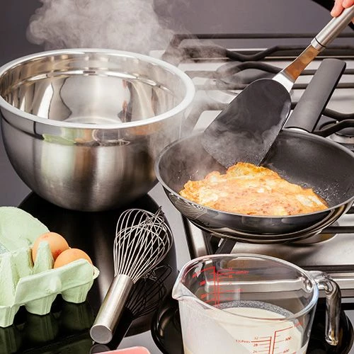 Tubular kitchen tool with circular hanging loops manufactured from 18/10 Stainless Steel and Nylon end.