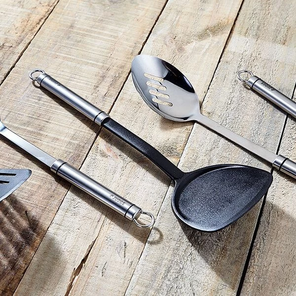 This Judge Tubular Nylon Ended Chinese Turner has a handle made from 18/10 stainless steel with a nylon head that makes it safe to use on non-stick surfaces.
