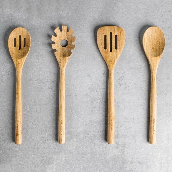 Crafted from eco-friendly bamboo, this KitchenAid 4-Piece Bamboo Tool Set comprises a slotted spoon, pasta fork, slotted turner and solid spoon. Each utensil is safe to use on all types of cookware and bakeware, including ceramic, cast iron and non-stick.