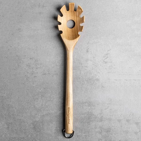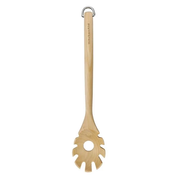 Crafted from environmentally friendly Birchwood, this KitchenAid Birchwood Pasta Fork is ideal for stirring and serving long pasta such as linguine and spaghetti. Can also be used to strain tube and swirl shaped pasta or vegetables thanks to the draining hole in the head of the utensil. Safe to use on all types of cookware and bakeware, including ceramic, cast iron and non-stick, this pasta fork also includes a handy stainless steel hanging hook.