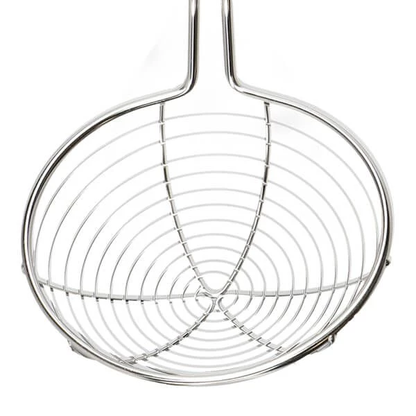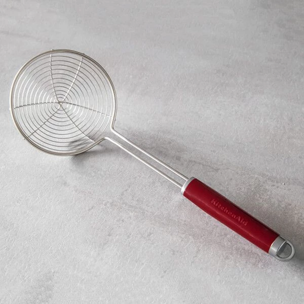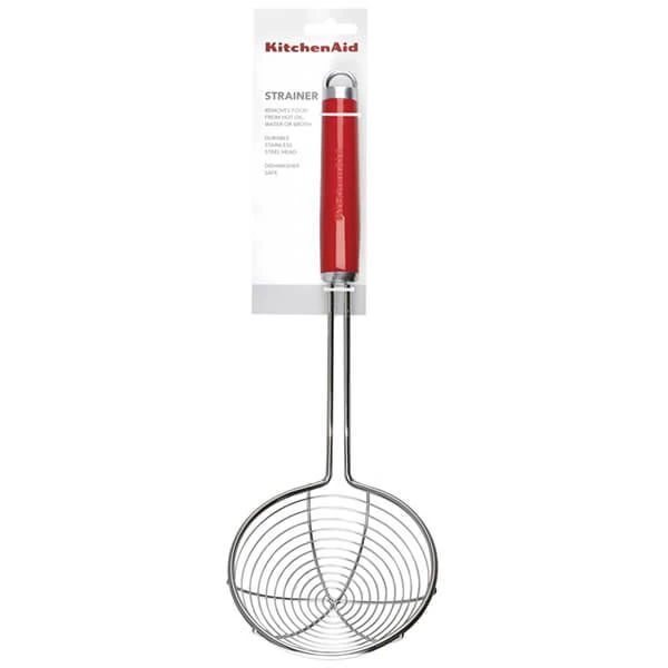 Crafted from premium grade materials, this KitchenAid Stainless Steel Spider Strainer in Empire Red easily scoops up dumplings and wontons. The extra wide stainless steel basket allows liquids to drain quickly and easily, making it perfect when stir frying or using a wok. Made from strong and durable stainless steel, the basket is also resistant to rust. The glossy handle includes a debossed logo and a satin chrome-plated bolster and hanging loop.