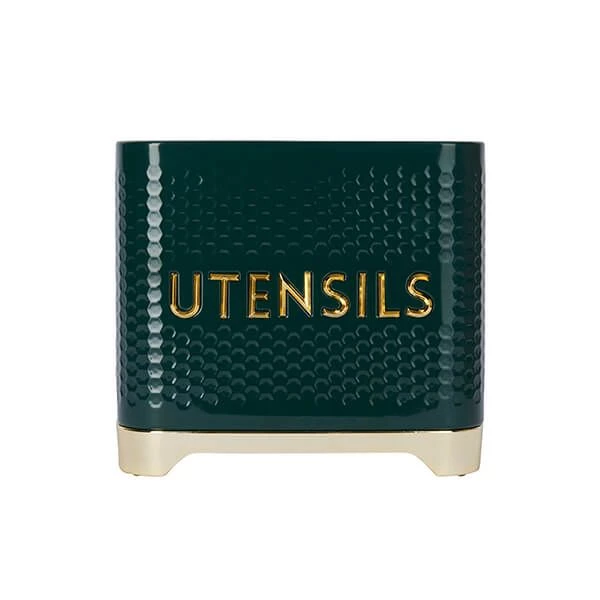 Keep your kitchen utensils organised and close to hand with this stylish, retro-modern Lovello Textured Hunter Green Utensil Holder. Featuring an eye-catching geometric texture and elegant curves, this utensil pot is made from durable carbon steel and finished with a luxe Hunter Green powder coating which helps prevent corrosion whilst making it easy to clean with a damp cloth. The word ‘UTENSIL’ is spelled out on the side of the pot, perfectly matching the brass coloured base.