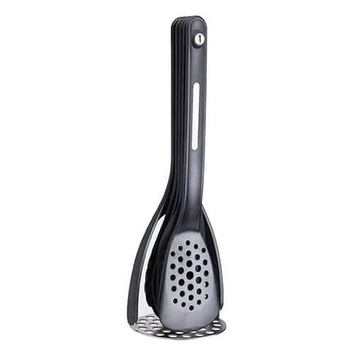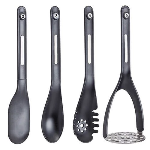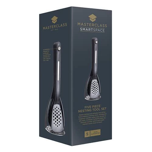 This MasterClass Smart Space 5 Piece Nesting Tool Set includes a Potato Masher, Slotted Turner, Turner, Pasta Serving Spoon and a Long Handled Spoon.