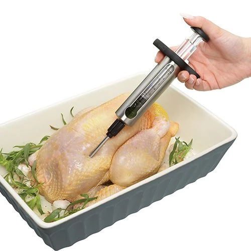 Professional injecting nozzle with two stainless steel injector nozzles; one thin for injecting liquid marinades and one thick to marinate using herbs, seasoning and sauces directly into the meat. The nozzles inject moisture quickly and cleanly deep into the meat keeping it moist. The elegant brushed stainless steel casing has a calibrated window allowing marinades to be measured accurately whilst injecting.