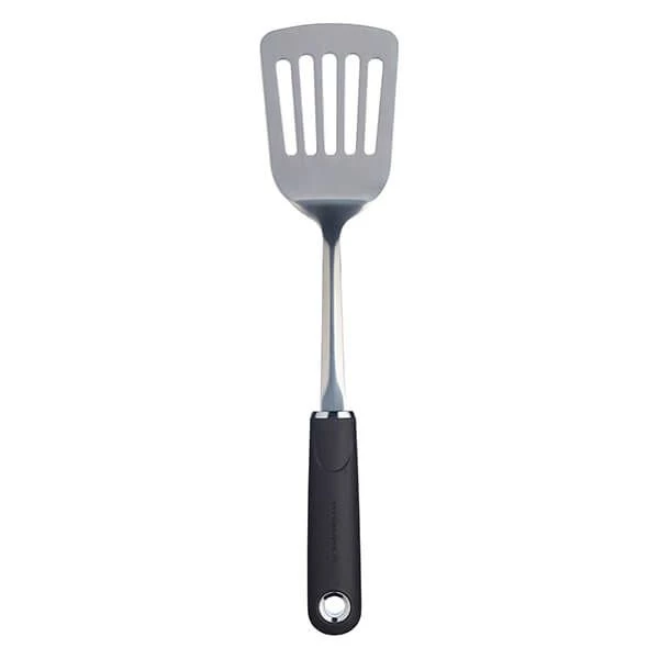The MasterClass Soft Grip Stainless Steel Slotted Turner is a useful kitchen utensil which can be used when cooking steaks, fish, burgers, pancakes and eggs.