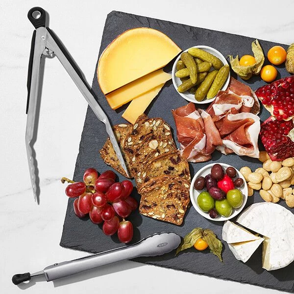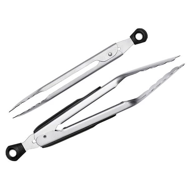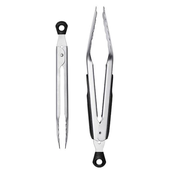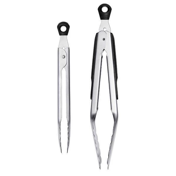 The Oxo Good Grips 2-Piece Tong Set includes a 7″ mini tong and 9″ tong. The Oxo Good Grips 7″ Mini Tong is ideal when small batch cooking and also for removing food from jars and serving cheese, meats and fruits. The Oxo Good Grips 9″ Tongs are made from brushed stainless steel with non-slip, soft handles that include comfortable thumb grips. The scalloped heads of the tongs will securely hold food when flipping, turning or lifting.